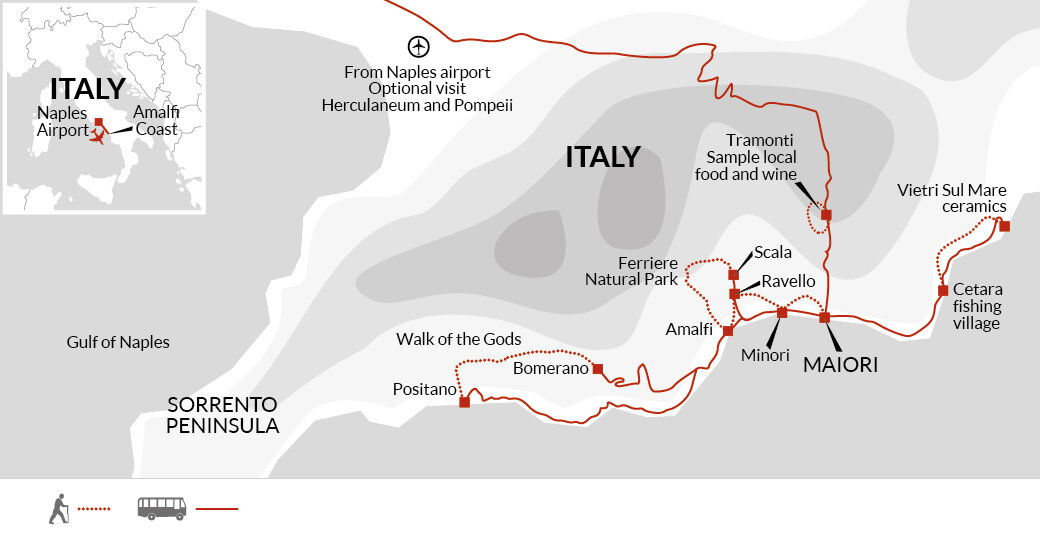 This morning, we'll take a short public bus east along the coast to the medieval fishing village of Cetara. It's a traditional fishing village, where for centuries fishermen have caught bluefin tuna, and today there are still many small fishing boats in the harbour. The village has developed a reputation for its food and there are countless fish restaurants. We'll have the opportunity to explore the pretty beach and meandering streets before heading off on our walk towards Vietri Sul Mare. Our walk takes us up above the coast with far-reaching views towards the Bay of Salerno. Our destination, Vietri Sul Mareis, is the 'first town' of the Amalfi Coast and is famous for its ceramics and pretty coloured houses. Here, you'll have some time to explore the shops and ceramics studios before heading back to Maiori/Minori by public bus.