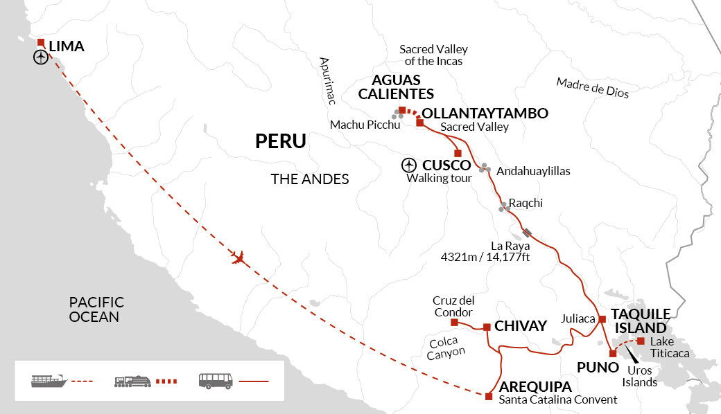 From Puno, we'll take a boat trip on Lake Titicaca to explore the floating reed islands, home to the Uros people who live on the lake itself. Their islands are made from totura, a reed-like papyrus that grows in the shallows and is used in most aspects of their life, including the construction of their boats and homes. We'll then continue to the lesser-visited island of Taquile which has preserved much of its Inca and pre-Inca heritage. Here, the islanders still speak the language of the Inca - Runa Simi or Quechua. We'll have approximately a twenty minute walk to our guesthouse from the dock, and this evening there will be the option to take a longer walk on the island for those who wish. Stay: Taquile Guesthouse (or similar) (Simple) (B)