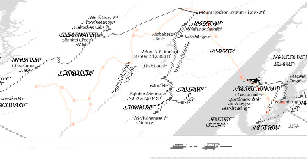 This morning, we'll follow Route 99 (more famously known as the Sea to Sky Highway) toward the Pacific Coast and Vancouver. We'll continue to Horseshoe Bay from where we'll catch the ferry across to Nanaimo on Vancouver Island. Although the island stretches almost 500 kilometres from north to south, it has a population of just 500,000 and, with its numerous provincial parks, it's easy to escape into the wilderness.
