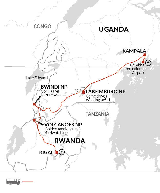We'll arrive in Bwindi National Park mid afternoon, home of the endangered mountain gorillas. The Bwindi Impenetrable Forest is one of Africa's most extensive belts of primary forest, with rolling hills and deep river gorges. This varied landscape is also home to a vast range of flora and fauna and rich birdlife. There will be time before dinner to take in the spectacular scenery, after dinner retire to the bar or sit round the fire pit and admire the amazing stars of the African night sky. Stay: Haven Lodge and Rest Camp (or similar) (Comfortable) (B/D)