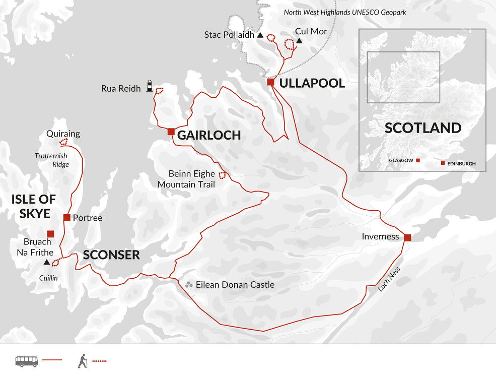Today's walk will take approximately six to seven hours and will cover a distance of 14 kilometres/8.7 miles, on rocky trails, with some scree and some off-trail sections, with a total ascent and descent of 950 metres/3,117 feet. Stay: Sconser Lodge (or similar) (Comfortable) (B)