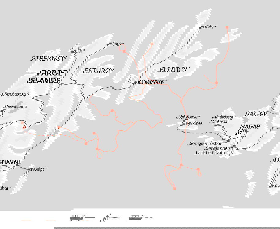 There are no activities planned today so you're free to arrive at any time. If you arrive earlier in the day, you might want to walk to the village of Sorvagur, located two kilometres away. It is considered one of the oldest villages in the Faroe Islands, with a small sandy beach and numerous fishing boats. The fishing industry still plays a crucial role in the local economy. Each group will vary, but if everyone arrives today, the introductory briefing will be held at 9:00 pm. If some guests arrive after that time, the briefing will instead take place at 9:00 am tomorrow morning. Stay: Hotel Vagar (or similar) (Comfortable)