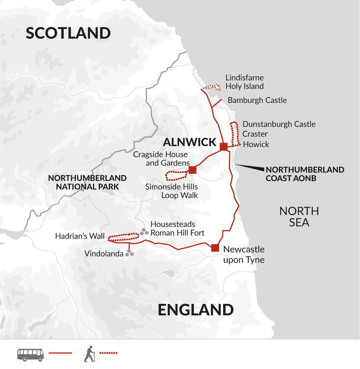 We drive (1.5hrs) inland today to Hadrian's Wall at The Sill Visitor Centre. This is one of the best-preserved sections of the wall, with Milecastles and Turrets, and part of our circular route walks alongside it with breathtaking views. Along the way we will pass the Sycamore Gap and Housesteads Roman Hill Fort for an optional visit (National Trust, entrance not included). After completing the walk, we drive a short distance for an optional visit the ruins of the Roman archaeological site of Vindolanda, a Roman auxiliary fort just south of the Wall that originally pre-dated it. Around 25% of Vindolanda has been excavated, archaeologists are still hard at work here and it may be possible to learn about that process and any recent finds.