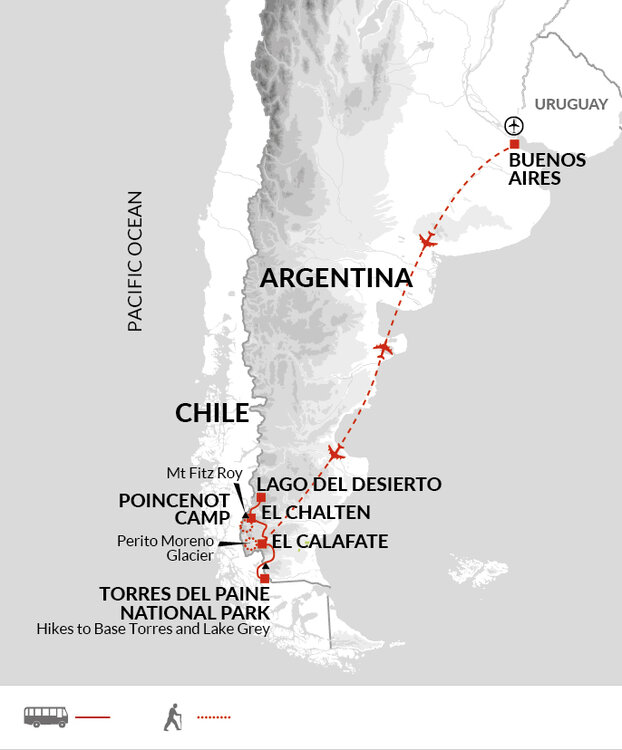 We'll walk past the clear glacial waters of the Madre (Mother) and Hija (Daughter) lagoons, and through Lenga Forest, on our way to Torre Lagoon. From here, weather permitting, we'll be rewarded with stunning views of Torre Massif and the surrounding glaciers as we enjoy a picnic lunch. Later, we'll continue our trek along Torre Trail back to El Chalten. We are reunited with our bags at our hotel this evening.