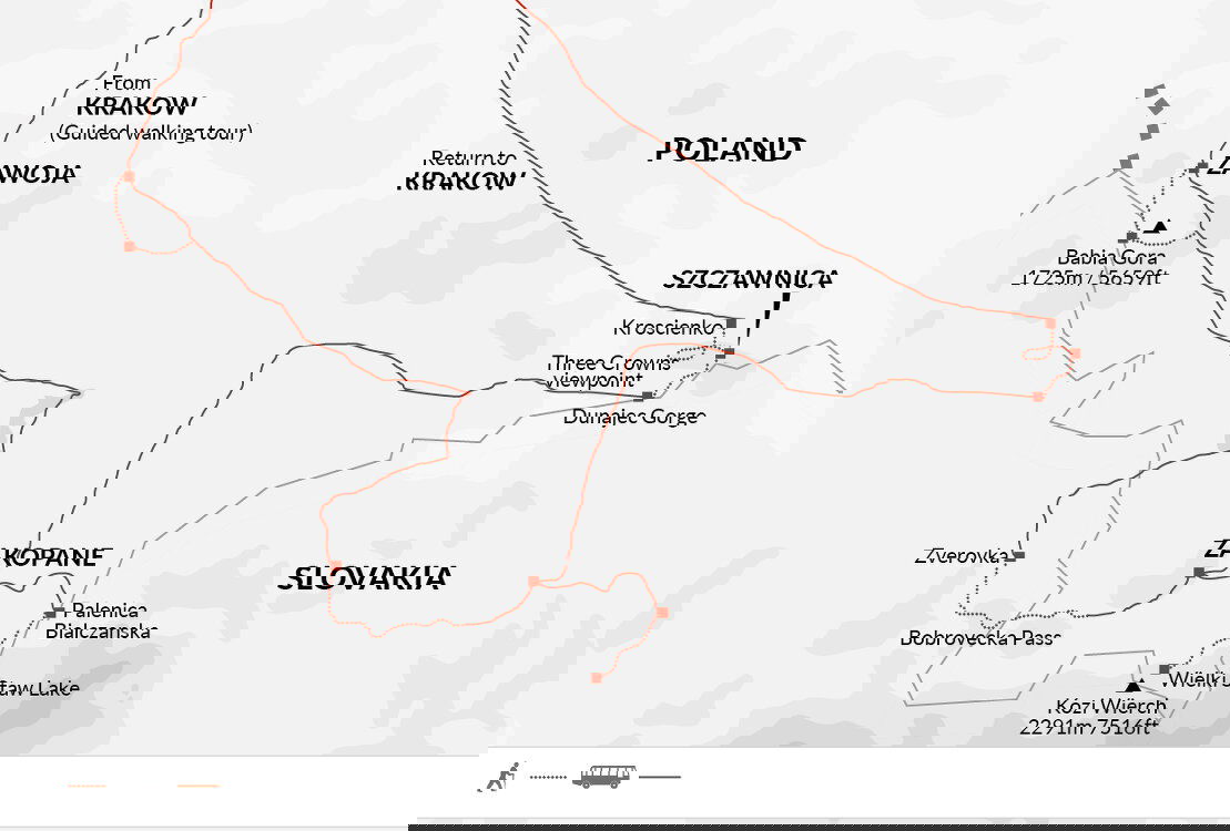 Once across the river, we begin our gradual ascent starting at 500 meters/1,641 feet through the forest to reach our first peak of the day, Sokolica (747 metres). After taking in the fabulous views, we continue to a green meadow before the final ascent to the peak of Trzy Korony (982 metres), the summit of the Three Crowns massif. There is an observation deck on top of the peak with views of the Dunajec River, Gorge and Pieniny National Park. We take a different trail down from the peak, looping the massif, enjoying the spectacular views of the limestone peaks, before descending to the bottom of the valley. Today's walk ends in Kroscienko town, where our driver will be waiting to take us on to Krakow (two hours).