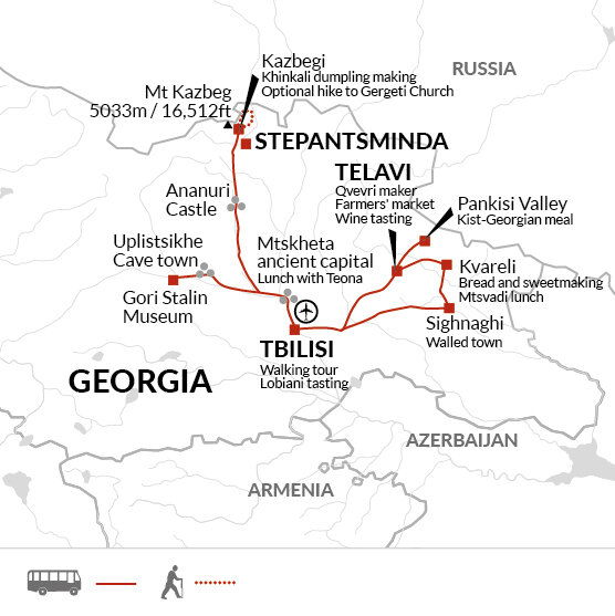 Today we'll head north towards the dramatic Caucasus Mountains and the Georgian-Russian border. The road, known as the Georgian Military Highway, has long served as both a trade route and as a means of invading Georgia from the north. On our journey, we'll pay a visit to Ananuri where two churches and a 17th-century fortress overlook the Zhinvali reservoir. Reaching Stepantsminda (formerly known as Kazbegi), the main town in the region, lying in the shadow of Mount Kazbek (5054m), we'll have time for a look around before calling in at the Art House to see how felt is made following the traditional process. We'll also have the chance to try some local jams and herbal teas. The inhabitants of the Caucasus forage from a wide variety of botanical sources for their herbal teas from bilberry and blackberry leaves to wild mountain thyme, rose hips, hawthorn berries and wild mint.
