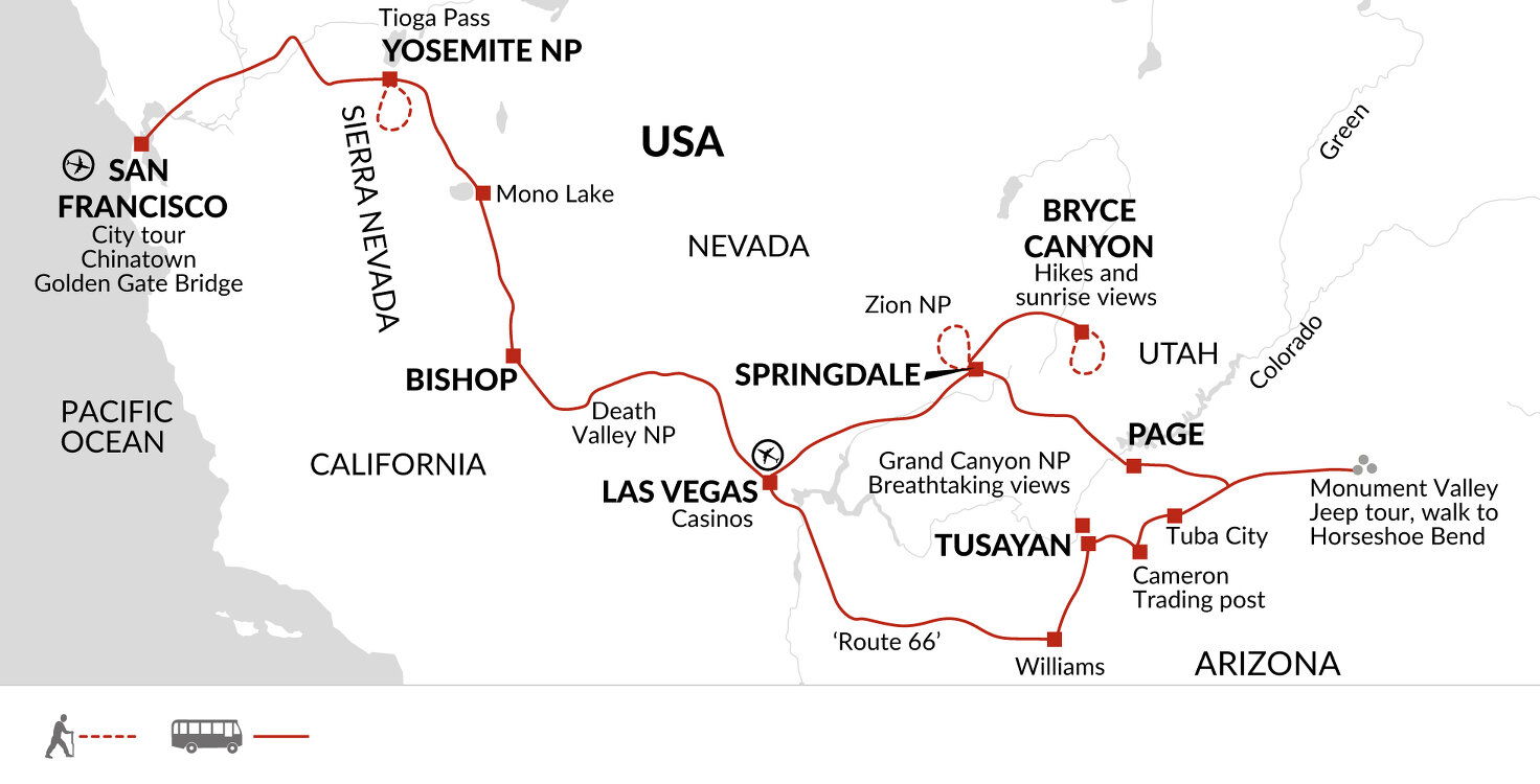 Due to the number of evening flights into San Francisco, our tour leader will hold a welcome meeting on the morning of Day 2 - timings will be left in the hotel reception. We don't provide arrival transfers on this tour, but information on how to reach the hotel will be provided in your final documentation.