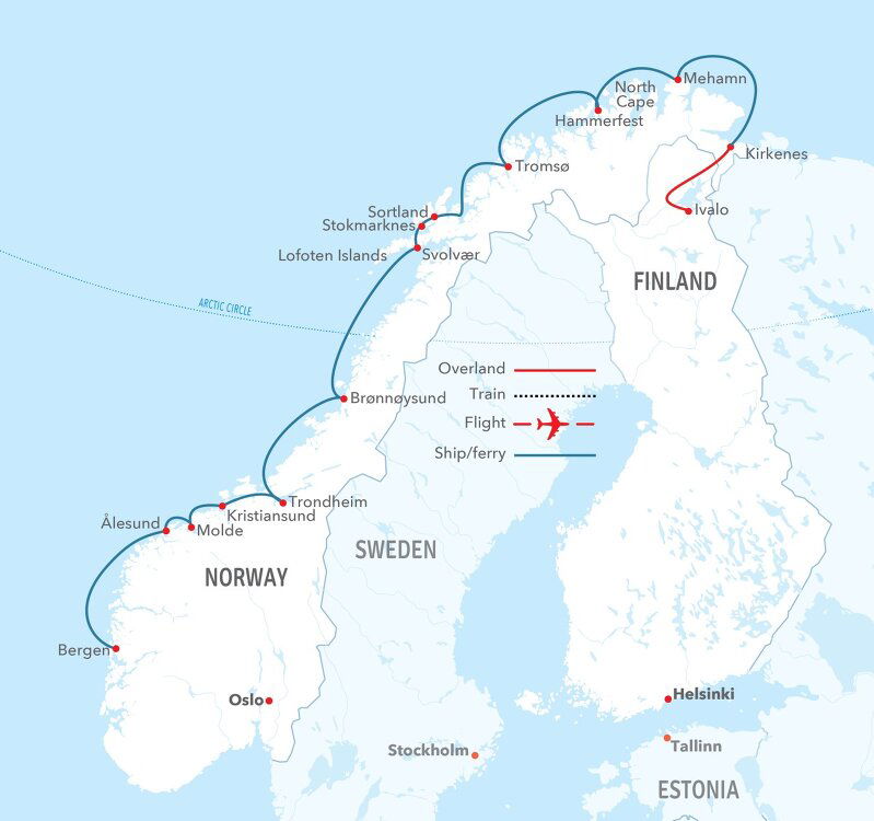 Please note: This tour is done by snowmobile (the fisherman drives the snowmobile with you in a sled behind the snowmobile), and not by divers or in a boat. Then transfer to the harbour to board the Havila Norwegian Coastal Voyage ship. As the ship starts its voyage south, you can first enjoy lunch then head up to the panorama lounge to enjoy the views of the surrounding Arctic landscape or venture on deck.
