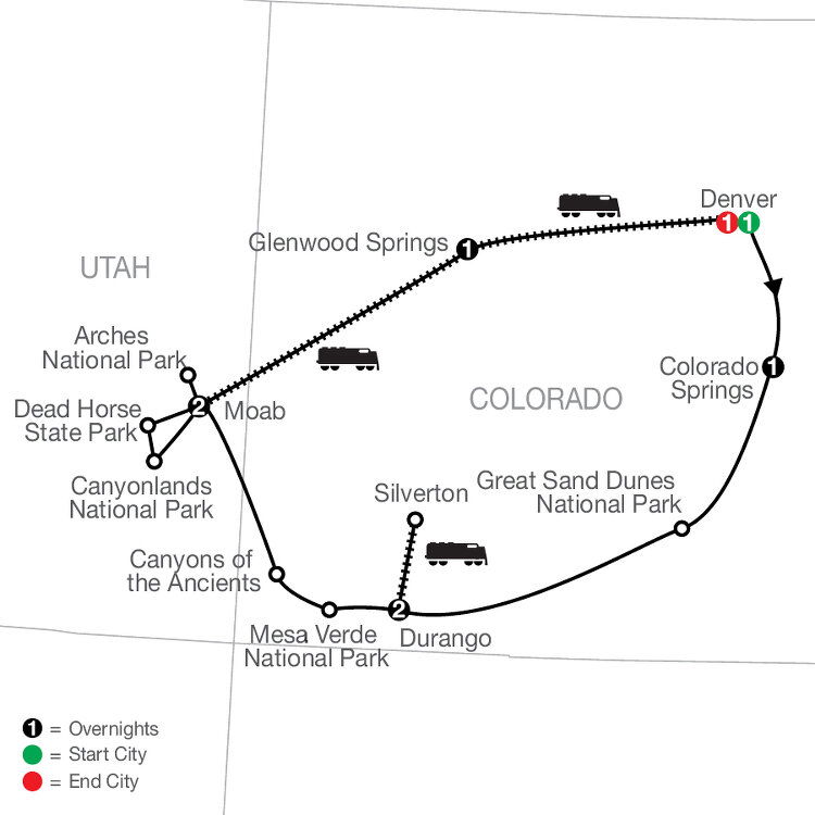 Today, explore the incredible landscape of Arches National Park, containing more than 2,000 natural sandstone arches, including the world-famous Delicate Arch. Then embark on the Canyon Spirit for a scenic train ride in Signature Class. Travel east through the Colorado Canyons National Conservation Area. See Parachute Creek and Mount Logan while following the scenic Colorado River. Take in the beautiful red rock formations, desert cliffs of Ruby Canyon, and mountain vistas. Overnight stay in historic Glenwood Springs, Colorado. (B/D)
