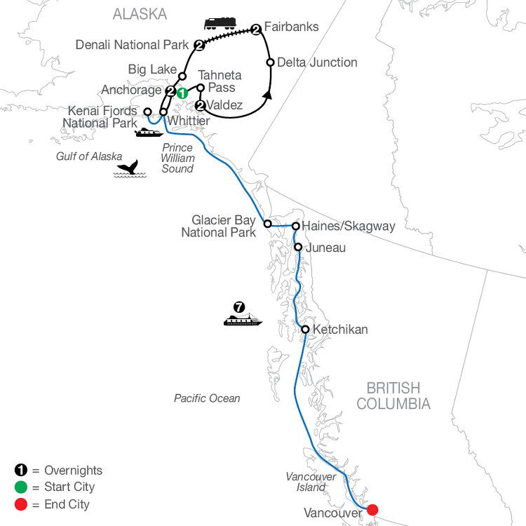 TOUR HIGHLIGHT - EPIC RIDE: Go deeper into the unmatched beauty of the Last Frontier with a scenic cruise on the Gulf of Alaska to explore just a part of this nearly 600,000 square-mile gulf reaching from the Alaska Peninsula and Kodiak Island in the west and Glacier Bay and the Inside Passage to the east.