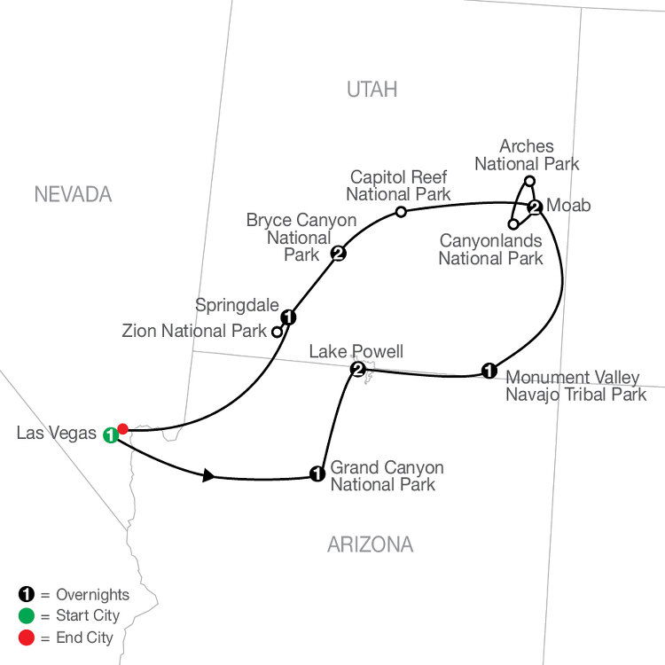After breakfast, say goodbye to the hoodoos and descend into a stunning ½-mile-deep canyon for Zion National Park. Enjoy scenic views of high desert landscape, soaring cliffs, narrow canyons and the Virgin River on the Zion-Mount Carmel Highway and Tunnel to Zion National Park. Experience traveling through an engineering marvel, the Zion-Mount Carmel Tunnel, built in the 1920s to connect Grand Canyon, Zion and Bryce National Parks. Enjoy a boxed picnic lunch on the front lawn of Zion Lodge with free time to explore. Continue to Las Vegas where your Tour Director hosts a farewell dinner. (B/L/D)