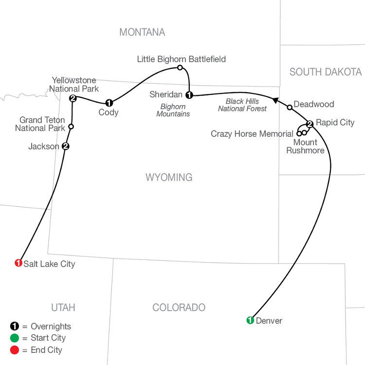 This morning, enjoy a scenic drive through Black Hills National Forest and experience the area's fascinating history on a guided tour of Deadwood. Then, continue through the Black Hills to the cattle town of Sheridan at the foot of the Bighorn Mountains. Tonight, enjoy dinner at a local restaurant featuring true Rocky Mountain hospitality. (B/D)