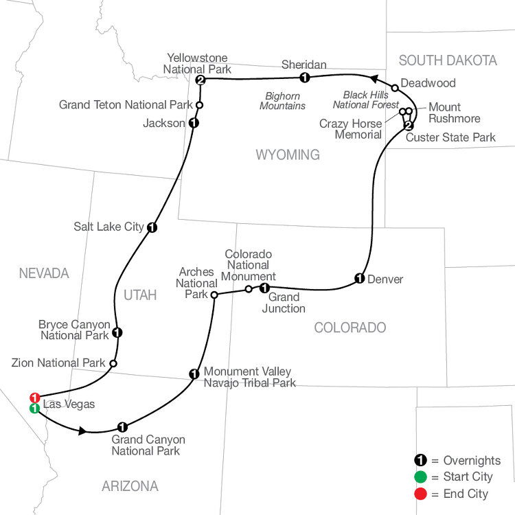 Start today by exploring the Wild West town of Deadwood. Next, enjoy a scenic drive through the Black Hills to the frontier town of Sheridan, located at the foot of the Bighorn Mountains. (B)