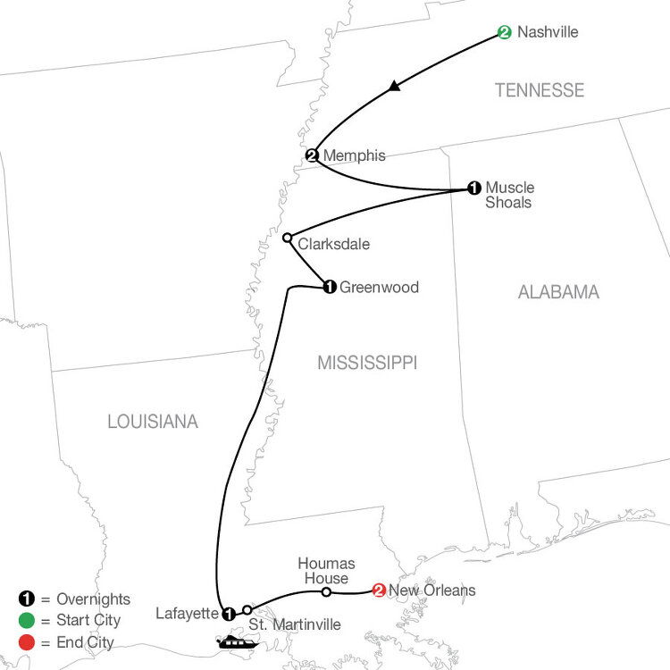 First stop today is Jackson, Mississippi, a city known for legendary music heritage and pivotal Civil Rights history. Continue to Lafayette, Louisiana and partake in a unique musical experience at Cypress Cove Landing on the banks of the Atchafalaya Basin. (B)