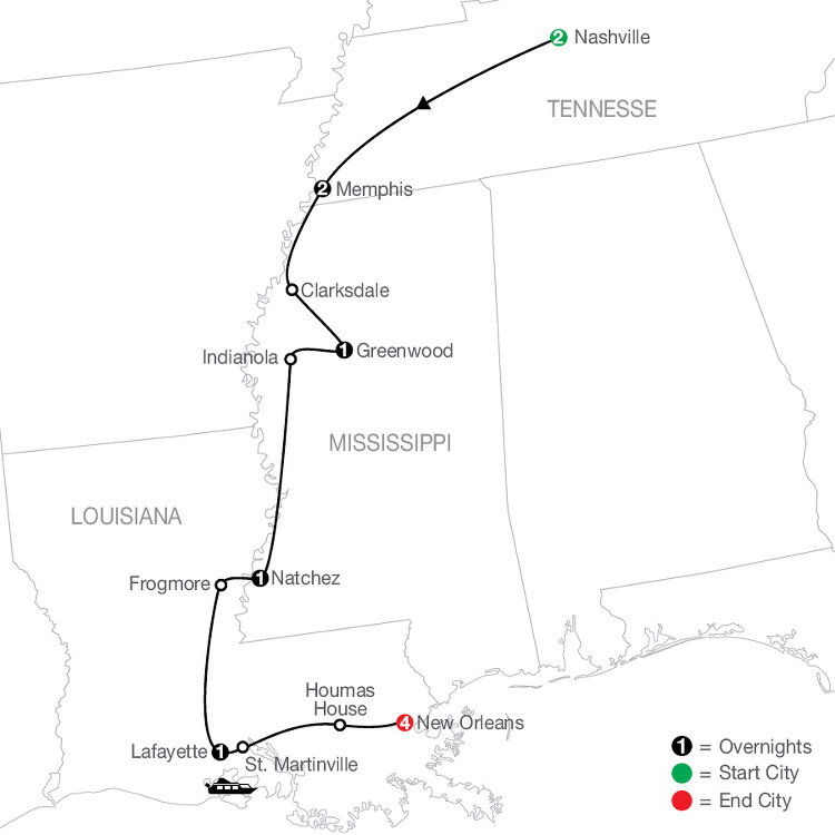 First stop today is Jackson, Mississippi, a city known for legendary music heritage and pivotal Civil Rights history. Continue to Lafayette, Louisiana and partake in a unique musical experience at Cypress Cove Landing on the banks of the Atchafalaya Basin. (B)