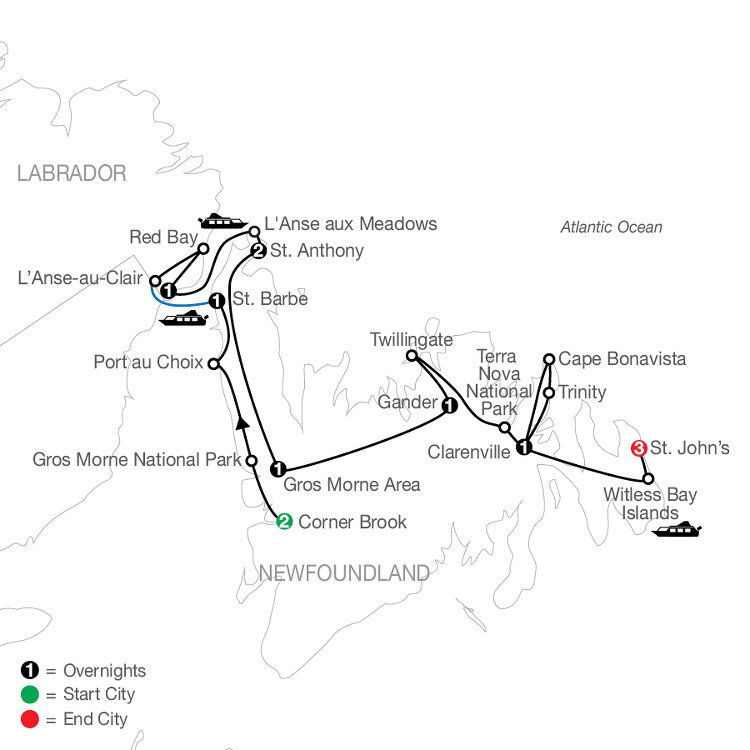 Travel to Cape Bonavista to admire the beautiful cliffs and coastlines. In Bonavista, learn how modern North America began when John Cabot made landfall here in 1497. A visit to Ryan Premises National Historic Site commemorates the prosperous fishing industry from the early 1500s to today. Later, continue to historic Trinity, one of the oldest communities in North America, with its scenic harbor. Enjoy a regional lunch at a local restaurant followed by a walking tour with a Local Guide to hear stories that bring this picturesque village alive. (B/L)