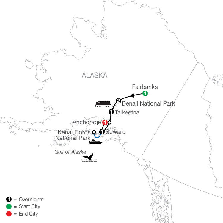 This morning, enjoy a traditional Alaskan treat from the historic Talkeetna Roadhouse. Then, head south toward Anchorage for a city tour and continue on a scenic drive along the Kenai Peninsula en route to Seward. Join your Tour Director and fellow travelers for a farewell dinner this evening. (B/D)