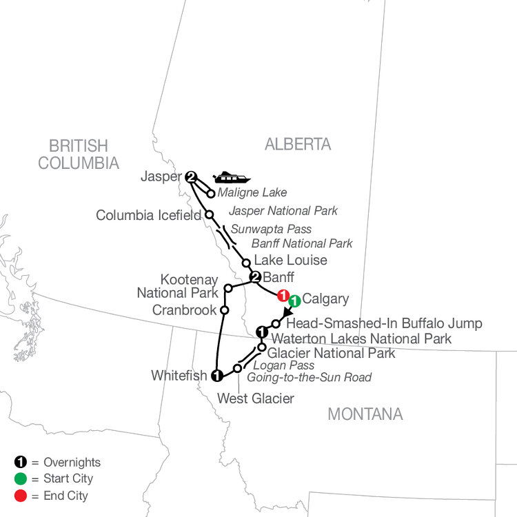 Before departing Calgary, enjoy an orientation tour of the city's highlights. Travel south along the Macleod Trail. Tour Head-Smashed-In Buffalo Jump, a UNESCO World Heritage Site, with a local First Nations guide. Then on to scenic Waterton Lakes National Park with a photo stop at Cameron Falls. (B/D)
