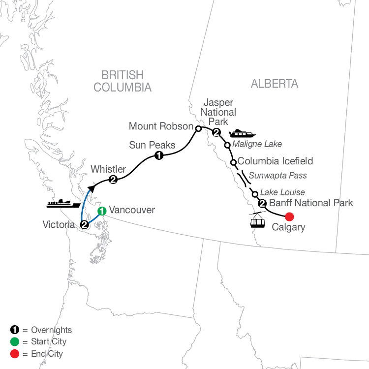 Tour Vancouver, including the waterfront, Chinatown, and Stanley Park with its old-growth evergreen forests and totem poles. Catch the BC Ferry over to Vancouver Island and Victoria. See major attractions on your city orientation tour including the Fairmont Empress Hotel, Bastion Square, and Thunderbird Park. Later, visit world-famous Butchart Gardens, followed by a special dinner in the former historic greenhouse. (B/D)