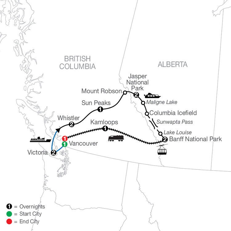 Tour Vancouver, including the waterfront, Chinatown, and Stanley Park with its old-growth evergreen forests and totem poles. Catch the BC Ferry over to Vancouver Island and Victoria. See major attractions on your city orientation tour including the Fairmont Empress Hotel, Bastion Square, and Thunderbird Park. Later, visit world-famous Butchart Gardens, followed by a special dinner in the former historic greenhouse. (B/D)