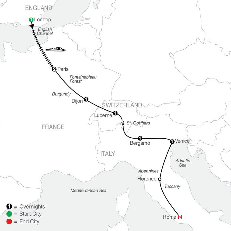 * For operational reasons, changes to the Paris program cannot be excluded.TOUR HIGHLIGHT - EPIC RIDE: Take the fast train to Paris on the Eurostar - the only high-speed rail directly linking the UK to France. Since 1994, passengers have been whisked through the longest section of underwater tunnel in the world in comfort with speeds up to 200 mph.