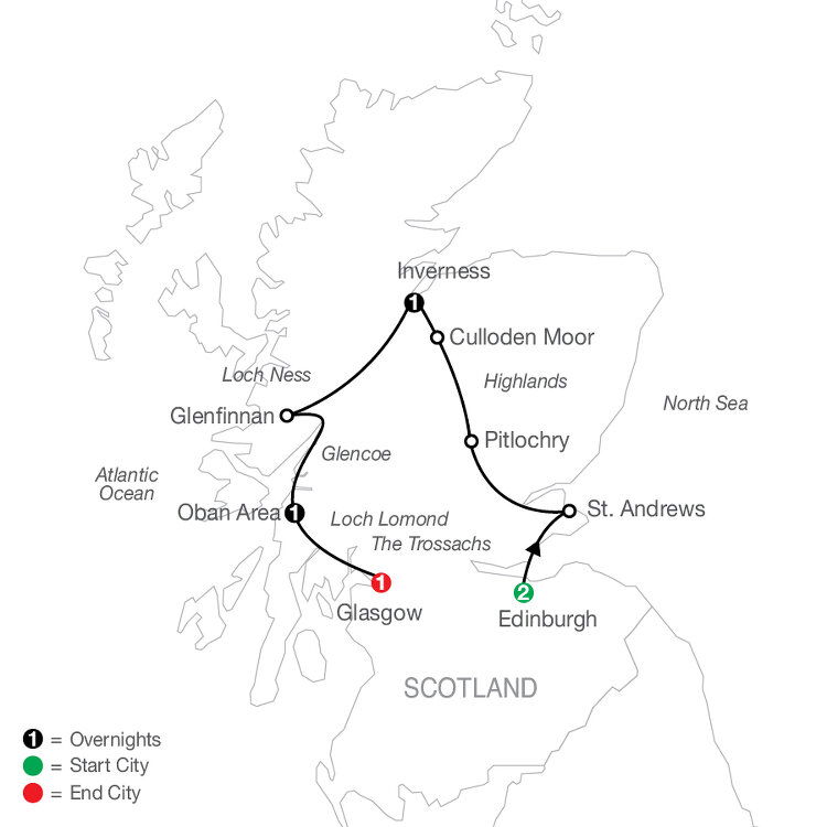 Travel over the elegant Forth Road Bridge to the university town of St. Andrews, famous also as the home of golf. A scenic drive through the dramatic Scottish countryside brings you to the Victorian town of Pitlochry. Enjoy a guided visit of a local whisky distillery. Overnight in the highland capital of Inverness. (B) 200 mi / 325 km.