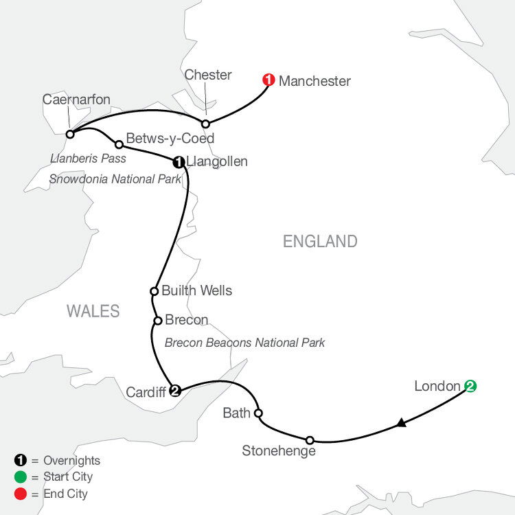 First today, stop at Betws-y-Coed, the gateway to Snowdonia National Park. The scenic drive through Snowdonia and over spectacular Llanberis Pass brings you to the city of Caernarfon. Cross the border into England and spend time in the walled, medieval city of Chester. Continue to Manchester for your overnight stay. (B/D) 174 mi / 280 km.