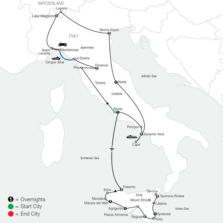 This morning visit Savoca, one of the film locations for “The Godfather.” After an orientation walk enjoy a Granita (semi-frozen drink) and brioche tasting at Bar Vitelli. Later, join an orientation walk in Taormina with a visit to the ancient Greek theatre. Free time to explore the town, stroll along stylish Corso Umberto and enjoy a leisurely lunch. This evening, join your travel companions for a farewell dinner at a local restaurant.(B/D) 56 mi / 90 km.