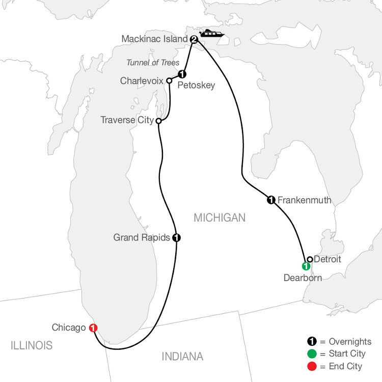 Depart by ferry from Mackinac Island, returning to mainland Michigan. Visit Old Mackinac Point Lighthouse State Park, a guiding beacon for ships since 1889. Stop at the historic Legs Inn for incredible views of Lake Michigan. Learn about the inn's fascinating history and sample traditional Polish specialties. Drive the Tunnel of Trees scenic route to Charlevoix, where a sightseeing tour with a Local Guide introduces you to the city's Victorian summer resorts and “Mushroom Houses.” Continue to your historic hotel in Petoskey, perched high on a bluff overlooking Lake Michigan for dinner and an overnight stay. (B/D)