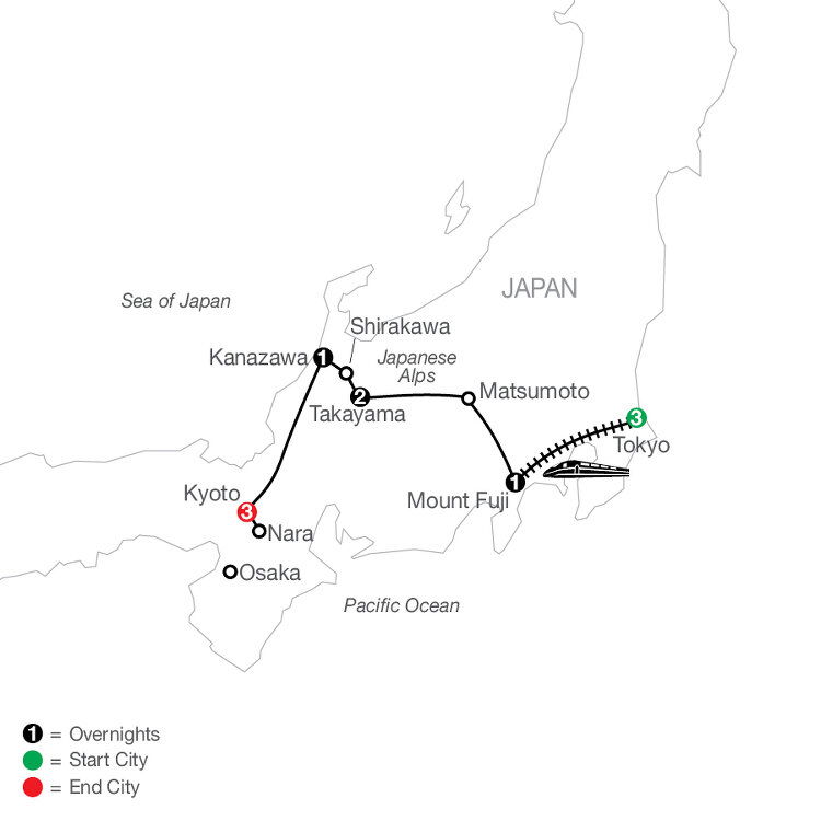 TOUR HIGHLIGHT - ACCOMMODATION HIGHLIGHT: Choose an overnight stay at a ryokan to fully immerse yourself in the Japanese culture and hospitality. Your ryokan features traditional touches like tatami mat floors, a thin sleeping mattress, and the chance to experience a Japanese-style bath – as well as the modern convenience of a private bathroom. Traditional Japanese dinner and breakfast are included in your stay. Please note that space is very limited.