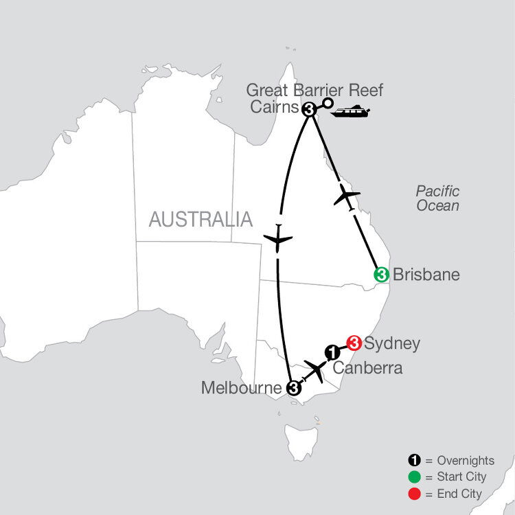 Fly to Canberra, Australia's capital city. Upon arrival, visit the Australian War Memorial. The evening is yours to explore the city's vibrant dining scene. (B)