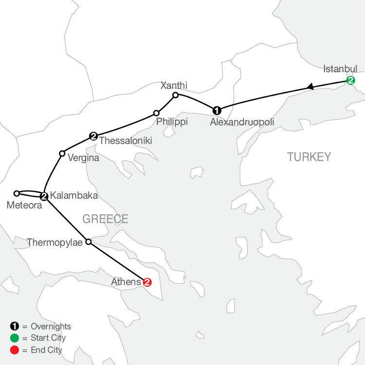 Today, depart Istanbul and take a scenic drive through the Marmaris region. Cross the border into Greece and continue to the city of Alexandroupoli for an orientation drive that includes views of the lighthouse and other landmarks. (B/D) 193 mi / 310 km.