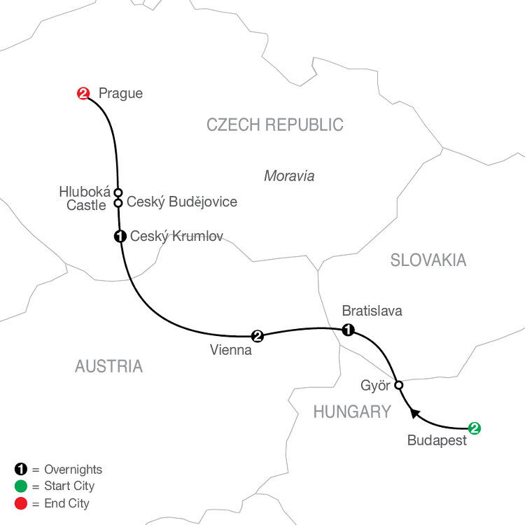 Depart Budapest and drive to Gyor, often referred to as the Baroque City, spend free time admiring the architecture whilst exploring the picture perfect Old Town. Later,continue to Bratislava, capital of Slovakia. Your guided sightseeing includes a walking tour of the historic center with a visit of St. Martin's Cathedral, the Coronation Church. An evening at leisure to see more of the city and try some local dishes. (B) 127mi / 205km.