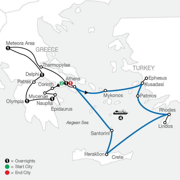 Wake-up in Athens for the start of your Greek Odyssey! Guided sightseeing is composed of an orientation drive to see Athen’s main landmarks, including Syntagma Square, the Temple of Zeus, and the Panathenaic Stadium, plus a visit to the iconic Acropolis. Enjoy free time this afternoon and evening to explore more. (B)