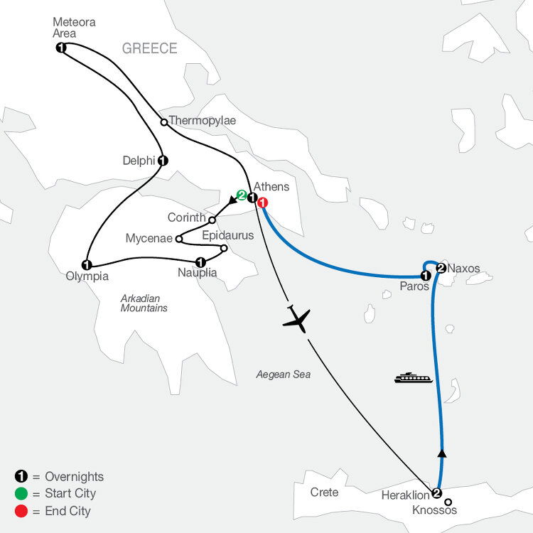 Today, take a ferry back to Athens. Enjoy free time later this afternoon and evening, perhaps visit a museum or take the tram to the coast. In the evening, enjoy the lively atmosphere of the tavernas in the old Plaka district with its narrow streets and sound of bouzouki music. (B)