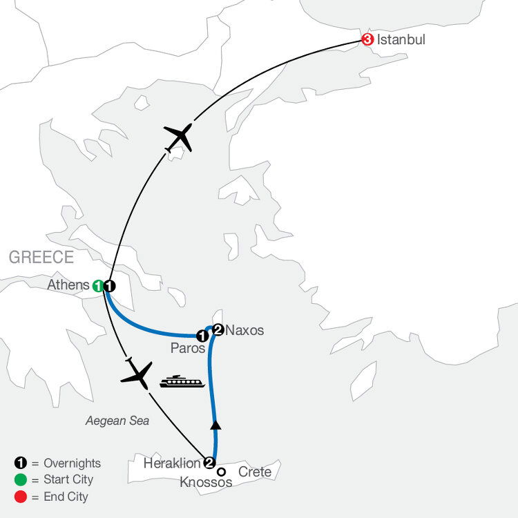 This morning, board a high-speed ferry for a ride across the Aegean to the island of Naxos. Enjoy guided sightseeing to see the highlights of Naxos town with its cobblestone alleys and Venetian castles. Then, a really sweet treat! Taste the famous citrus spoon dessert at a local kafenio (cafè). Later, enjoy some leisure time to explore more of the island. (B/D)