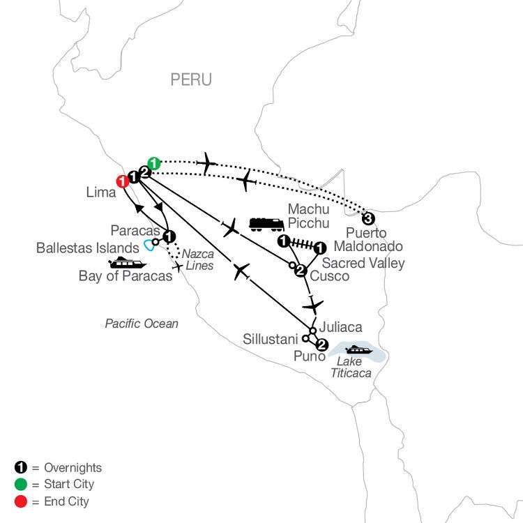 Continue to the town of Pisco, the wine capital of Peru. Have your camera handy today as you board your aircraft for flightseeing over the Nazca plains, which can only be appreciated by air. Dating back to 500 BC, these geoglyphs etched into the ground consist of over 10,000 lines depicting plants and animals Enjoy dinner this evening at your hotel. (B/D)