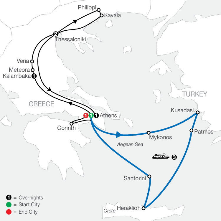 Depart Thessaloniki for a scenic drive. Stop at Thermopylae, site of a famous battle. See the statue of Leonidas and learn about the heroic resistance of the 300 Spartans. Continue to Athens and enjoy a leisurely evening exploring. (B) 314 mi / 503 km