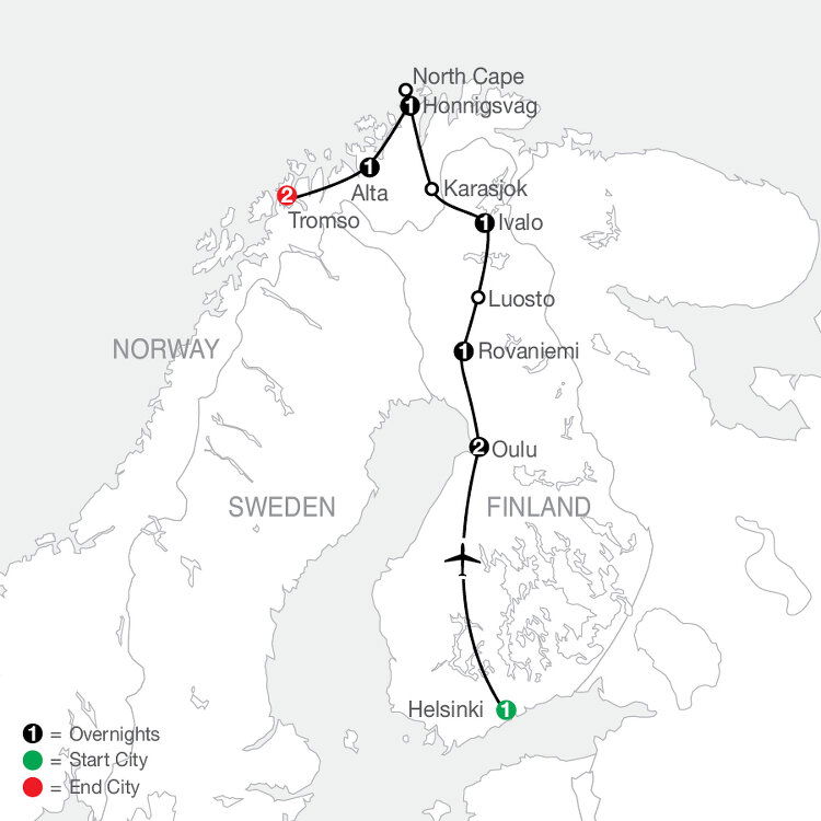 This morning, follow your Local Guide on a sightseeing tour to discover Helsinki's main highlights, including the City Hall, Presidential Palace, Lutheran Cathedral, Sibelius Monument, and open-air market. After some free time for browsing, head to the airport for your flight to Oulu. (B/D)