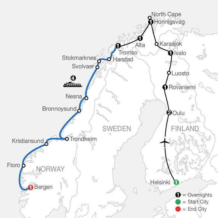Today, cross the border into Norway and stop at Karasjok to visit the Sámi Cultural Park, to learn about the traditions and lifestyle of this semi-nomadic people. Later, reach Honningsvag, the most northerly town in Norway. (B/D) 242mi/ 390km.