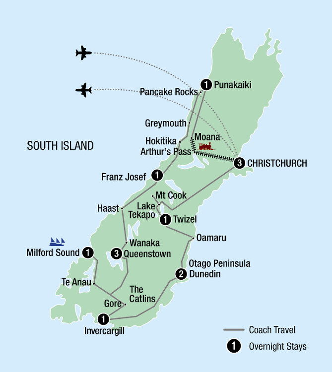 This morning board the TranzAlpine, renowned as one of the great train journeys of the world. Travel over massive viaducts, river valleys and spectacular gorges before descending through the Otira Tunnel to Moana, on the banks of picturesque Lake Brunner. Enjoy lunch at Kingfisher Restaurant before travelling to the coastal town of Punakaiki. Stay: Scenic Hotel Punakaiki (B/L/D)