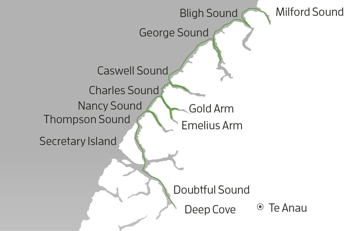 Today we have the exploration of the southern-most of the northern fiords on our agenda. Flanked by steep mountains including Mount Napier and Command Peak, Nancy Sound was likely named after the vessel Nancy by Captain John Grono, one of the early sealing captains to explore Fiordland. Nancy Sound's unusual leg shape was not lost on those who named it bestowing the section it turns at right angles to the north Foot Arm, which dutifully moves into Heel Cove and Toe Cove. Leg Head and Bend Point were similarly literally named.