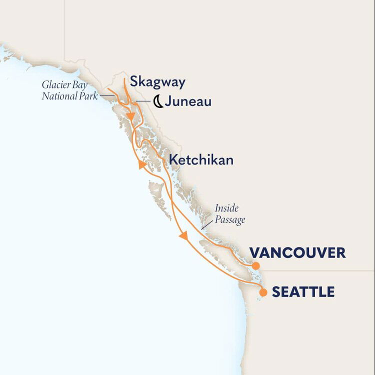 Alaska's Inside Passage offers breathtaking views of glaciers, fjords, and abundant wildlife , making it one of the most scenic cruises in the world and one of the few locations where deep-draft ships can sail close to steep mountain walls. Stretching from Puget Sound in Washington to the Alaskan Panhandle, this coastal route provides stunning natural scenery. Expect to see orcas, humpback whales, and sea lions from the deck, while eagles soar overhead.