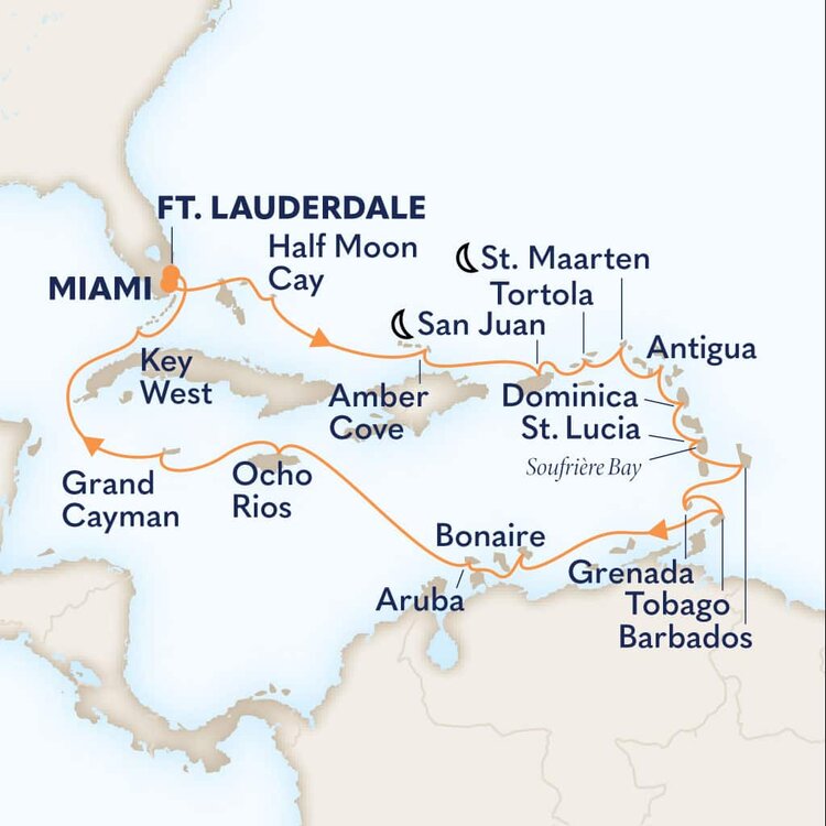This multicultural city where the sun rules supreme is more than just a cruise port. Palm-lined causeways stretch across luminous Biscayne Bay as Miami rises in a gleam of glass towers, Art Deco curves, and tropical colour. Along Ocean Drive in South Beach, pastel facades from the 1930s glow beneath the Florida sun, while nearby Little Havana hums with domino parks, cigar shops, and the aroma of Cuban coffee. Beyond the shoreline, calm waters, yacht marinas, and breezy promenades frame a city shaped by Caribbean rhythms and sunlit coastal glamour.