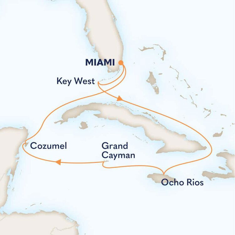 The southernmost point of the United States, Key West is known for its glorious sunshine, wild beaches, historical charm and carefree attitude. It boasts year-round tropical weather, and some of the clearest snorkelling and most preserved coral reef structures in the world. Ships will dock at this port.