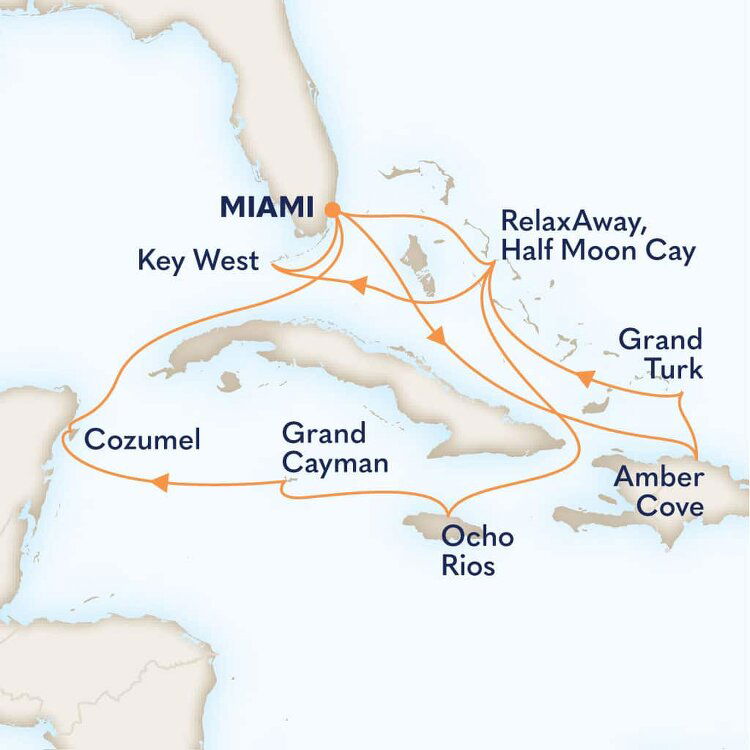 This multicultural city where the sun rules supreme is more than just a cruise port. Visitors from all over the world enjoy Miami’s famous Art Deco buildings, family-friendly zoos and romantic palm tree-lined streets filled with fantastic restaurants. Don’t forget about the white sandy beaches and year-round warm weather, perfect for relaxing before or after your Caribbean cruise from Miami.