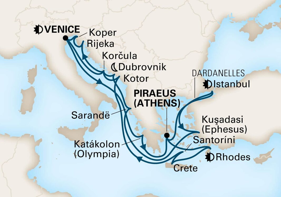 Souda Bay’s huge natural harbour is a spectacular entrance to Greece's largest island, Crete. Packed with beautiful beaches and rich maritime history, Crete is also a treasure trove of well-stocked museums, rich archaeological sites and charming Venetian fishing towns. Ships will dock at the Port of Souda.