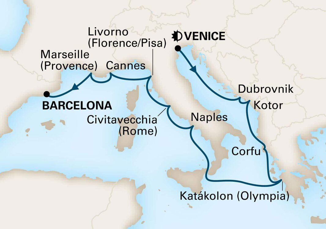 Your cruise finishes today in Barcelona, a captivating city on Spain's northeastern coast. If you're extending your stay in the city, start with a visit to La Sagrada Família, Antoni Gaudí's masterpiece, then wander through the narrow, historic streets of the Gothic Quarter.