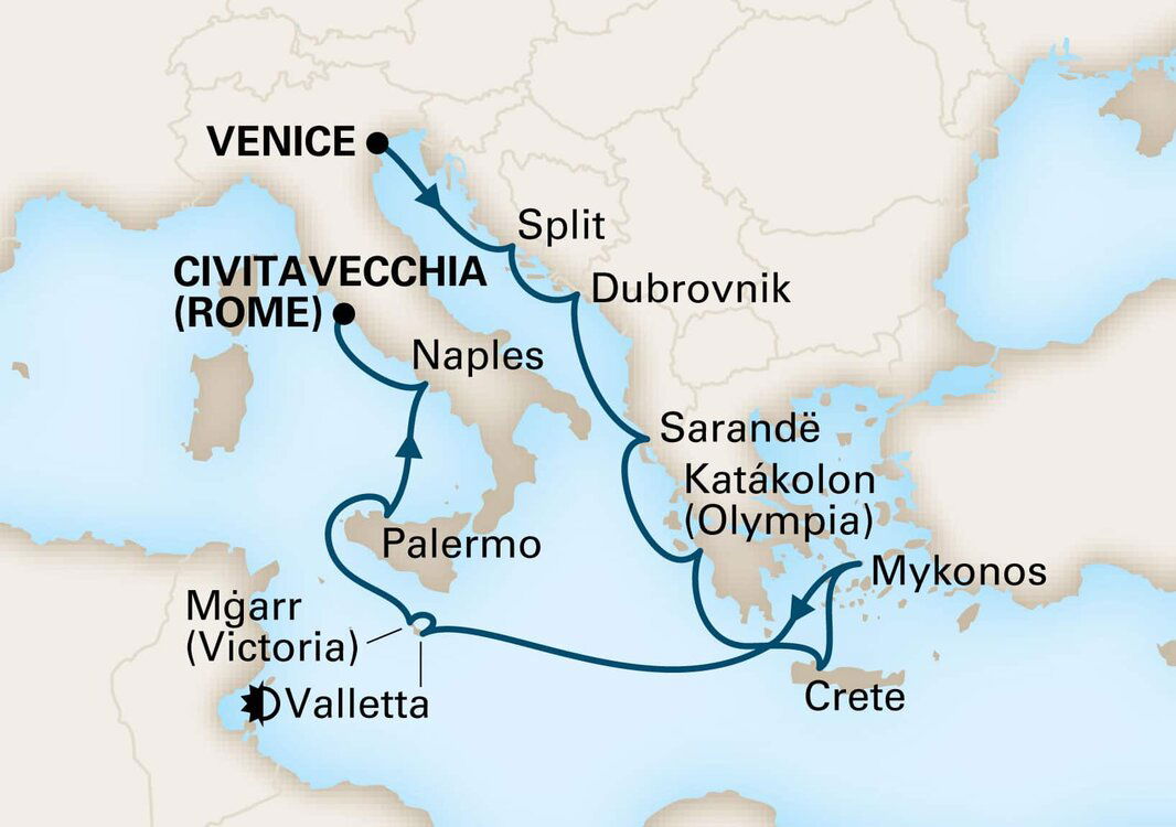 Souda Bay’s huge natural harbour is a spectacular entrance to Greece's largest island, Crete. Packed with beautiful beaches and rich maritime history, Crete is also a treasure trove of well-stocked museums, rich archaeological sites and charming Venetian fishing towns. Ships will dock at the Port of Souda.