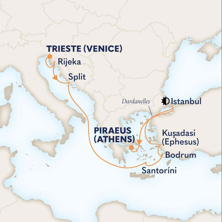 Venice is approximately 150 kilometers (93 miles) away, a journey that takes about 2 hours by train if you are making your own way to Trieste from Venice. Alternatively, your cruise documents will outline alternative transfer options.